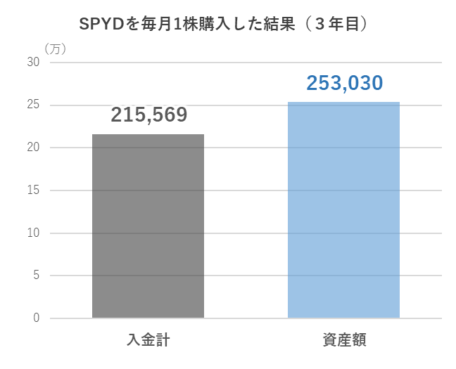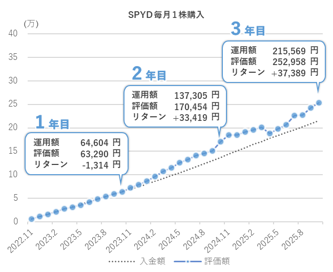 SPYD(SPDR®ポートフォリオS&P500®高配当株式ETF)を、元手ゼロから毎月1株ずつ積み立ててきました。