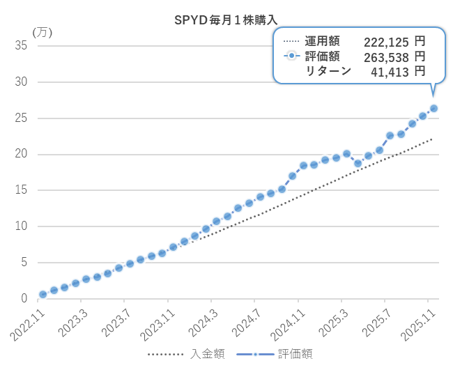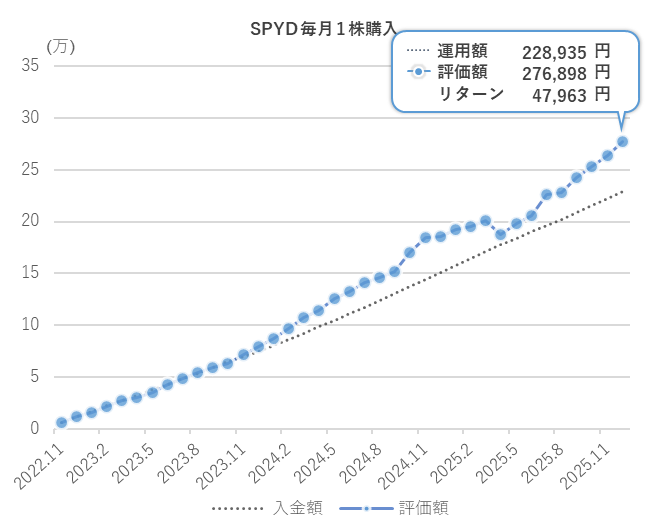 SPYD(SPDR®ポートフォリオS&P500®高配当株式ETF)を、元手ゼロから毎月1株ずつ積立しています。
