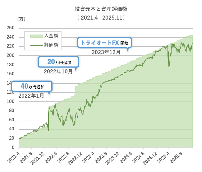 初期費用20万円からはじめて、毎月3万円ずつ運用金額を増やしています。